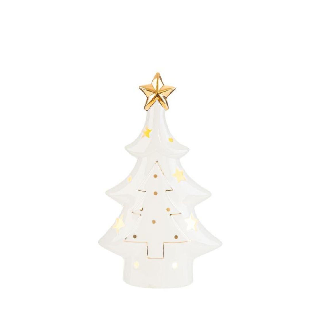 Albero di Natale realizzato in porcellana bianca con dettagli oro con luce a led di misure 12,5x6x20,5cm. Posiziona questo albero in porcellana firmato Le Stelle su un mobile o su un tavolino da salotto per accenderlo e vivere un’atmosfera ancor più Natalizia.