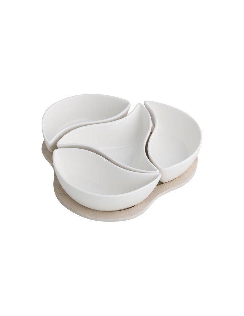 L’ antipastiera Trifoglio in porcellana bianca con supporto in bamboo naturale e un prodotto di Brandani. Utile, pratica e scomponibile per antipasti e aperitivi.