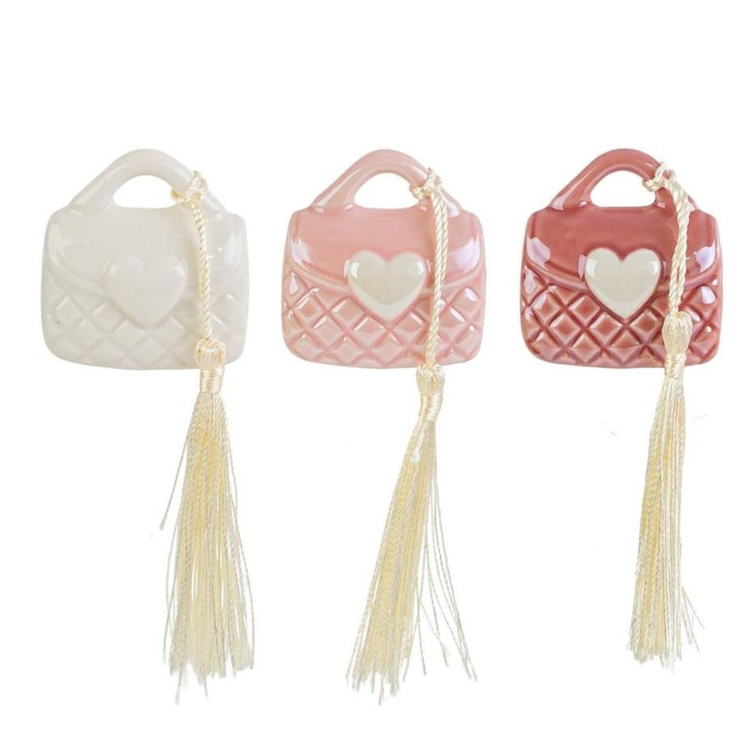Ogni borsetta è realizzata in porcellana e proposta in 3 colori assortiti. Il prezzo si riferisce alla singola unità; la spedizione avviene in modo assortito in base alla disponibilità di magazzino, garantendo varietà e armonia nelle composizioni. Un’idea bomboniera versatile, femminile e sempre attuale.