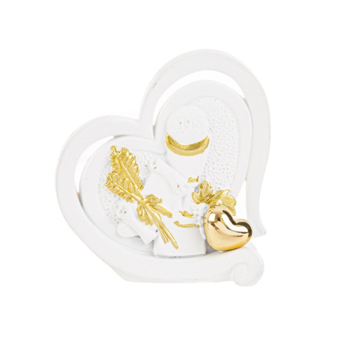 Calamita cuore Comunione in resina 6cm bianca e oro di Le Stelle, ideale come bomboniere per Prima Comunione o segnaposti per Comunione.