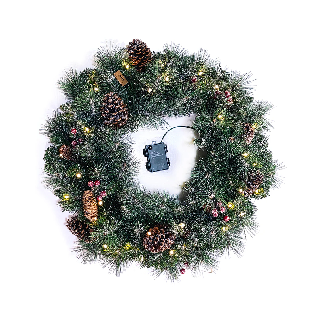 Ghirlanda di Natale con luci a led bianco caldo di diametro 60cm. Questa ghirlanda natalizia è dotata di 35 luci a led con funzionamento a bottone: luce fissa e flash, timer flash, timer fissa , off. Inoltre le luci sono alimentate da 3 pile stilo AA non incluse. La ghirlanda fuoriporta con bacche e pigne è adatta sia per uso esterno che per uso interno della casa.