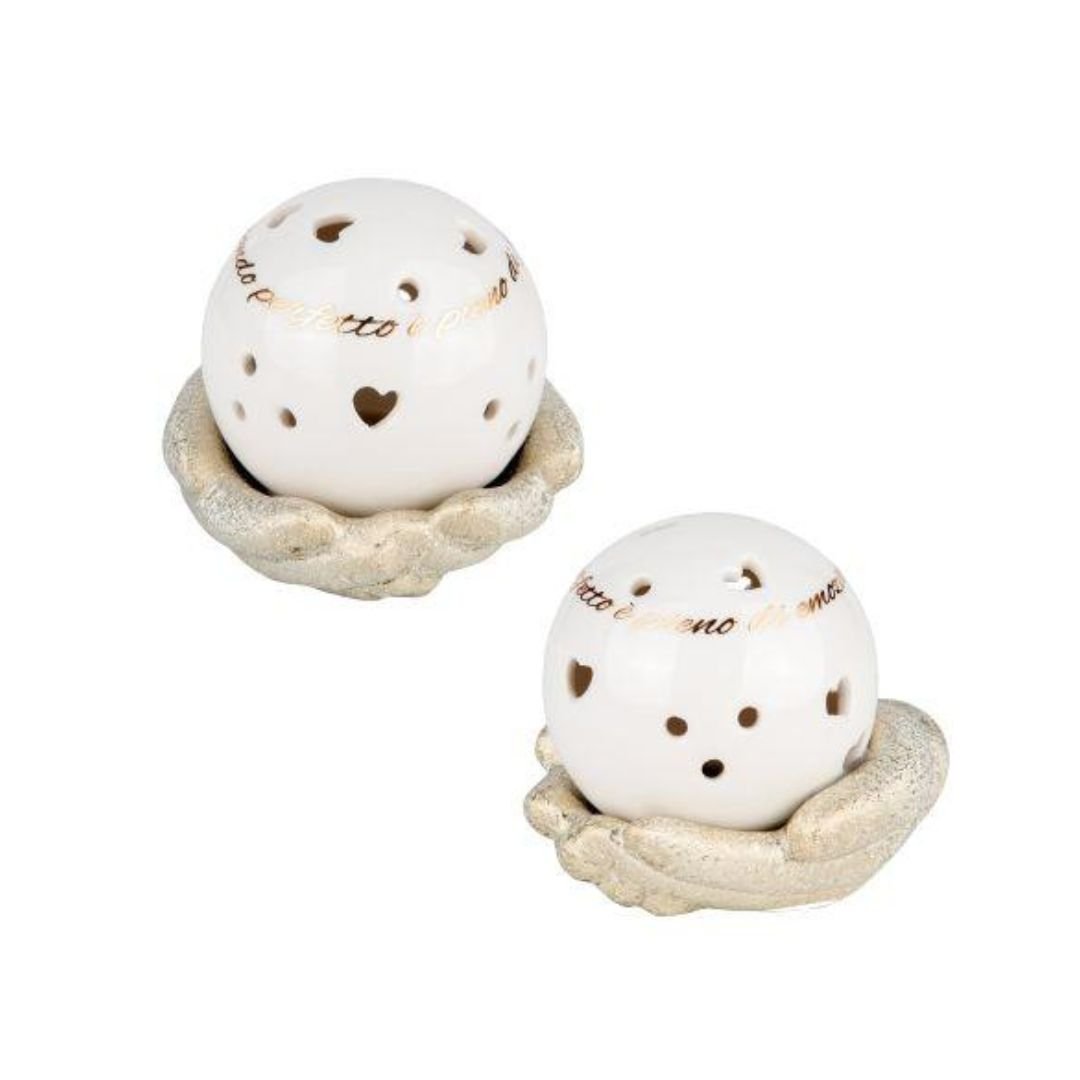Il Globo su Mani a Led Oro ETM Creazioni è una bomboniera elegante e simbolica, pensata per rappresentare valori universali come amore, protezione, unione e speranza. La sfera, ispirata al mappamondo, è delicatamente sorretta da mani in porcellana impreziosite da dettagli dorati, creando un oggetto decorativo raffinato e ricco di significato. La presenza della luce a LED valorizza la forma del globo, diffondendo una luminosità calda e accogliente.