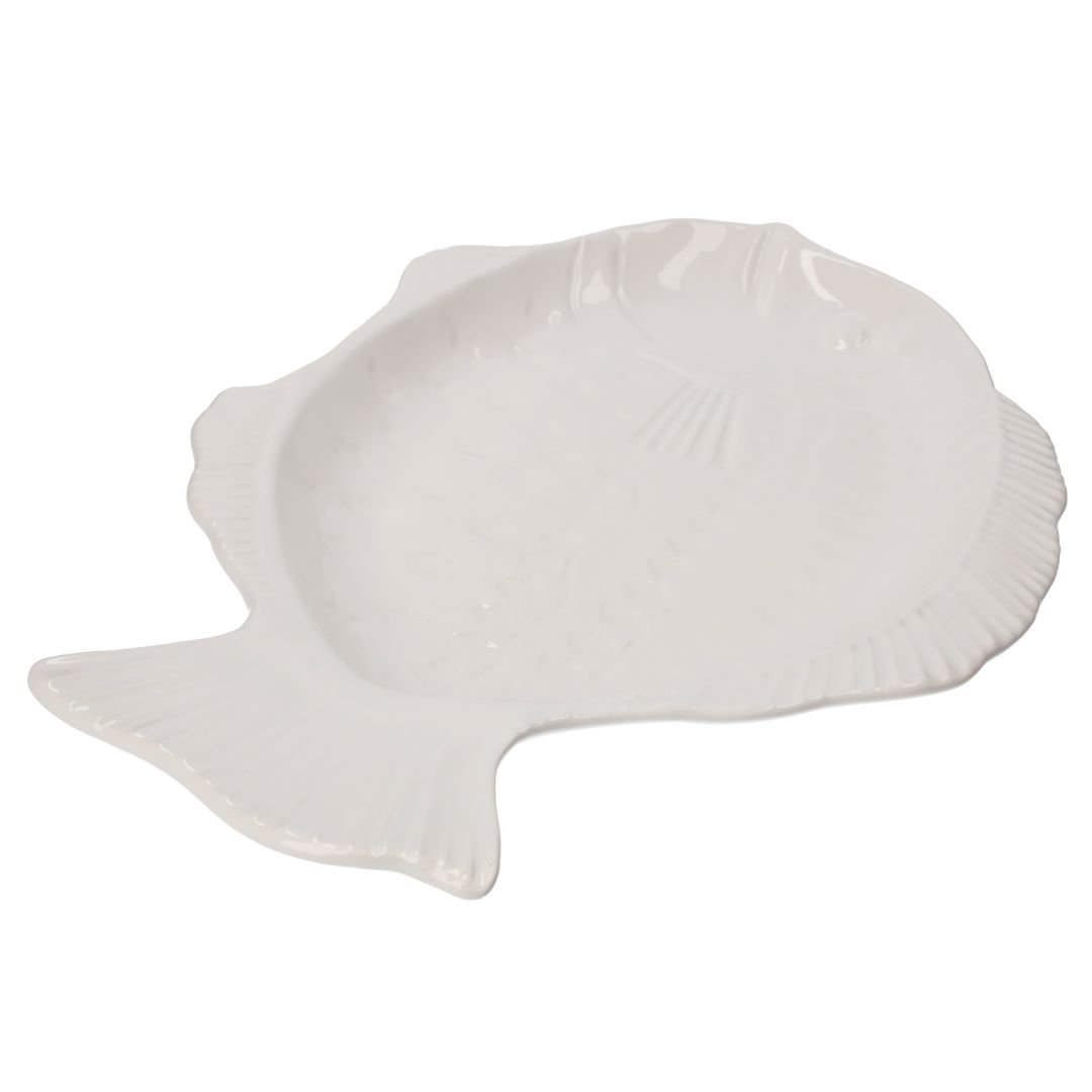 Piatto portata pesce grande realizzato in ceramica bianca e marchiato Mastecraft di misure 60x40x5cm. Ideale come decorazione per la tavola per servire primi, secondi e antipasti di pesce. Inoltre questo piatto a forma di pesce può essere utilizzato come decorazione per la casa come centrotavola.