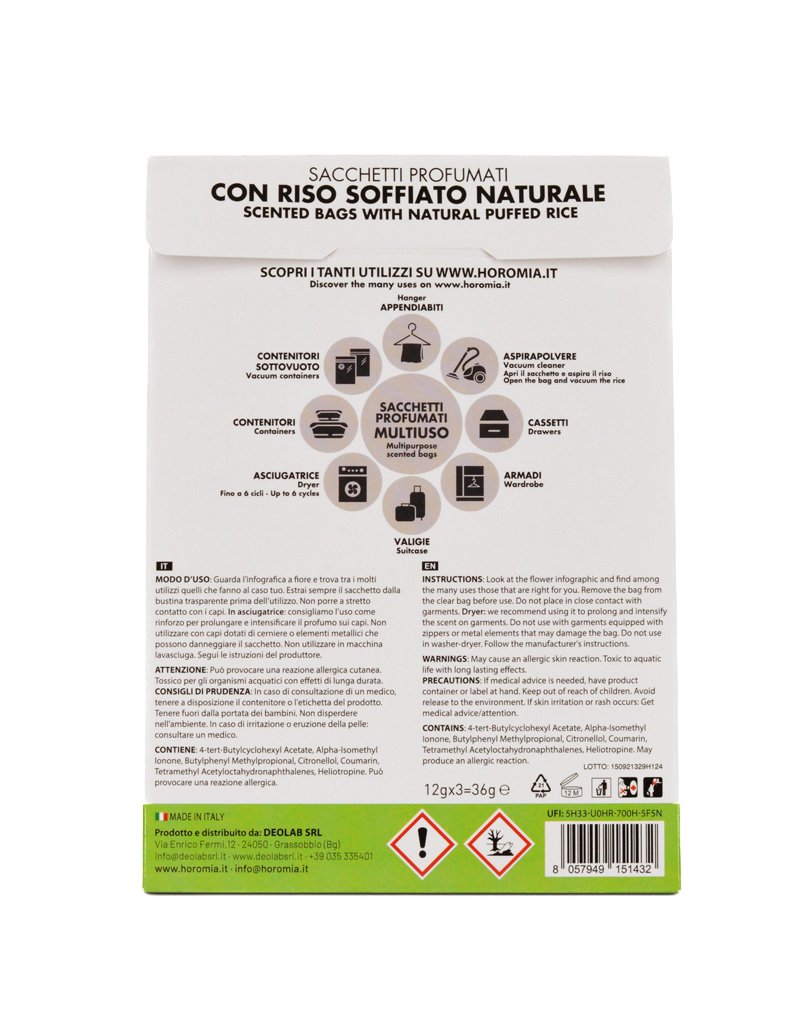 L’unicità e l’intensità delle fragranze Horomia ora in Sacchetti Profumati Multiuso. Creati con riso soffiato naturale non alimentare, i sacchetti profumati Horomia sono formulati per donare ai tuoi capi e alla tua casa il profumo unico e inconfondibile della tua fragranza preferita. Ogni confezione contiene tre sacchetti profumati avvolti in una busta trasparente ad alta protezione, per un profumo intenso e duraturo fino a 12 settimane.