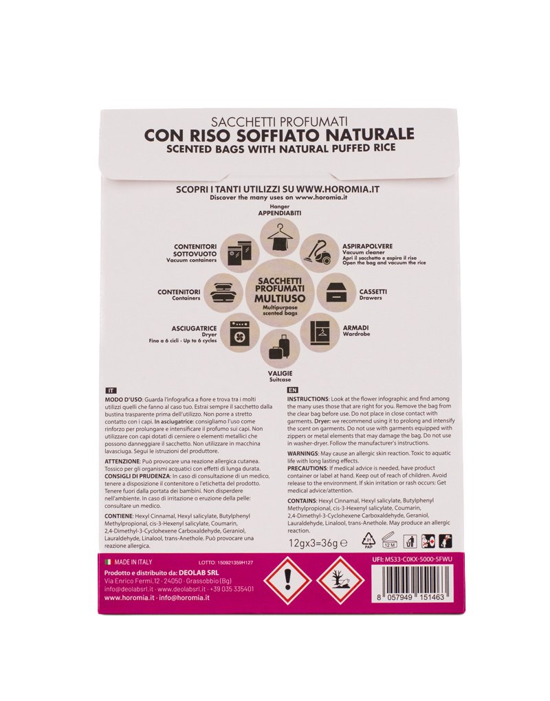 L’unicità e l’intensità delle fragranze Horomia ora in Sacchetti Profumati Multiuso. Creati con riso soffiato naturale non alimentare, i sacchetti profumati Horomia sono formulati per donare ai tuoi capi e alla tua casa il profumo unico e inconfondibile della tua fragranza preferita. Ogni confezione contiene tre sacchetti profumati avvolti in una busta trasparente ad alta protezione, per un profumo intenso e duraturo fino a 12 settimane.