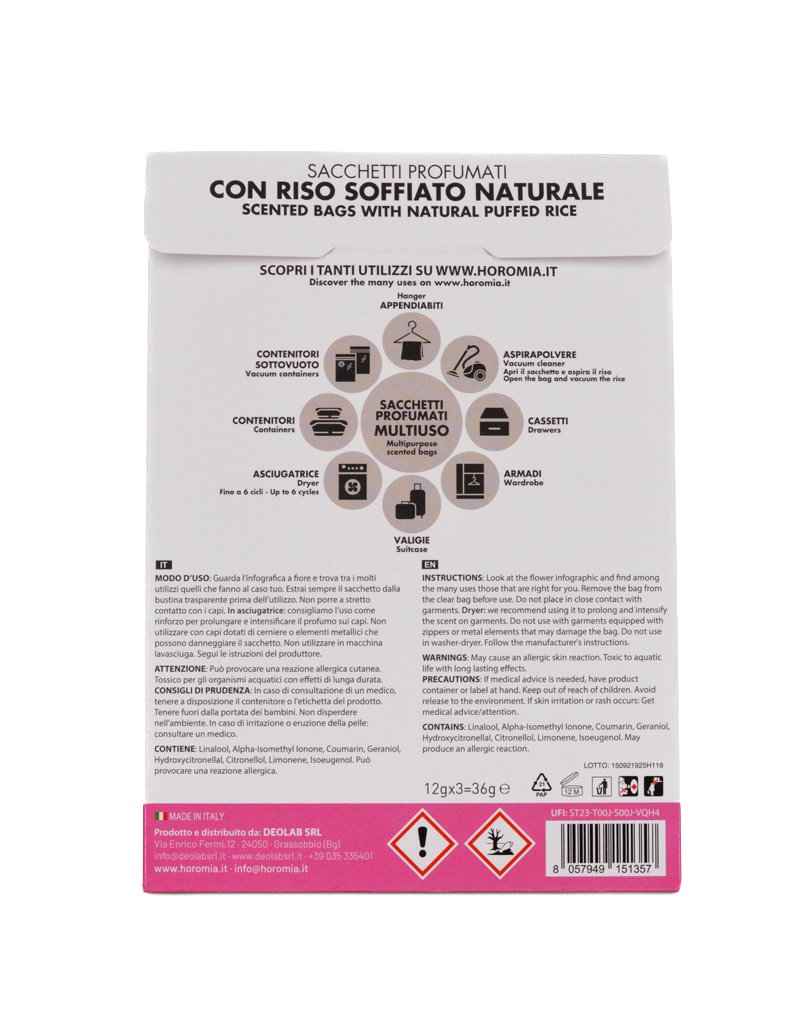 L’unicità e l’intensità delle fragranze Horomia ora in Sacchetti Profumati Multiuso. Creati con riso soffiato naturale non alimentare, i sacchetti profumati Horomia sono formulati per donare ai tuoi capi e alla tua casa il profumo unico e inconfondibile della tua fragranza preferita. Ogni confezione contiene tre sacchetti profumati avvolti in una busta trasparente ad alta protezione, per un profumo intenso e duraturo fino a 12 settimane.