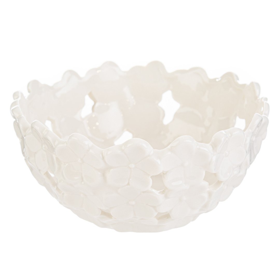 Questo elegantissimo portacioccolatini in porcellana bianca traforata a fiori può essere regalato come bomboniera per qualsiasi evento.