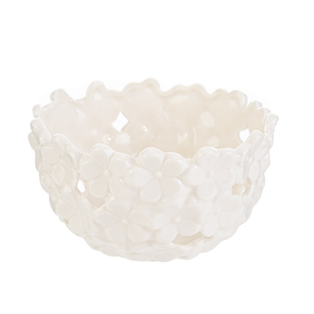 Questo elegantissimo portacioccolatini in porcellana bianca traforata a fiori può essere regalato come bomboniera per qualsiasi evento.