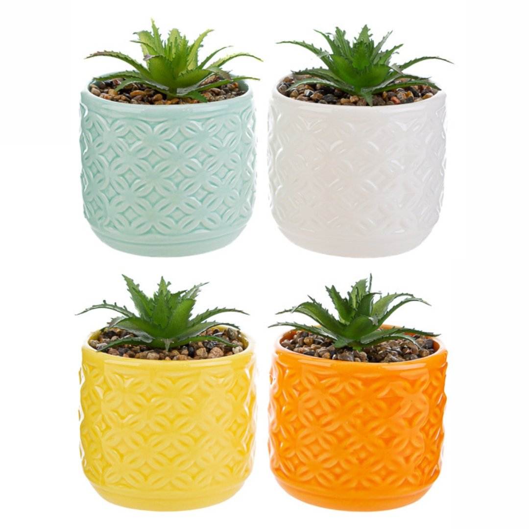 Regala un vasetto in ceramica colorato con a piantina artificiale inclusa, un dettaglio semplice e colorato per una casa o per un ufficio.