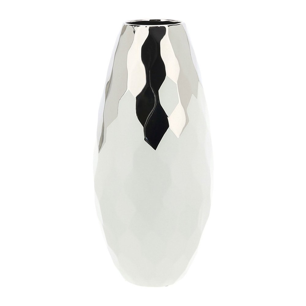 Vaso realizzato in gres porcellanato con esagoni di colore bianco e argento firmato Hervit Creation. Misura 20cm di diametro e 44cm di altezza, un vaso moderno che si abbina ai contesti color argento e bianco.